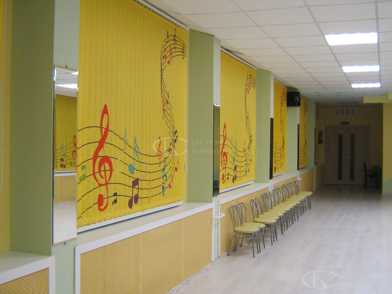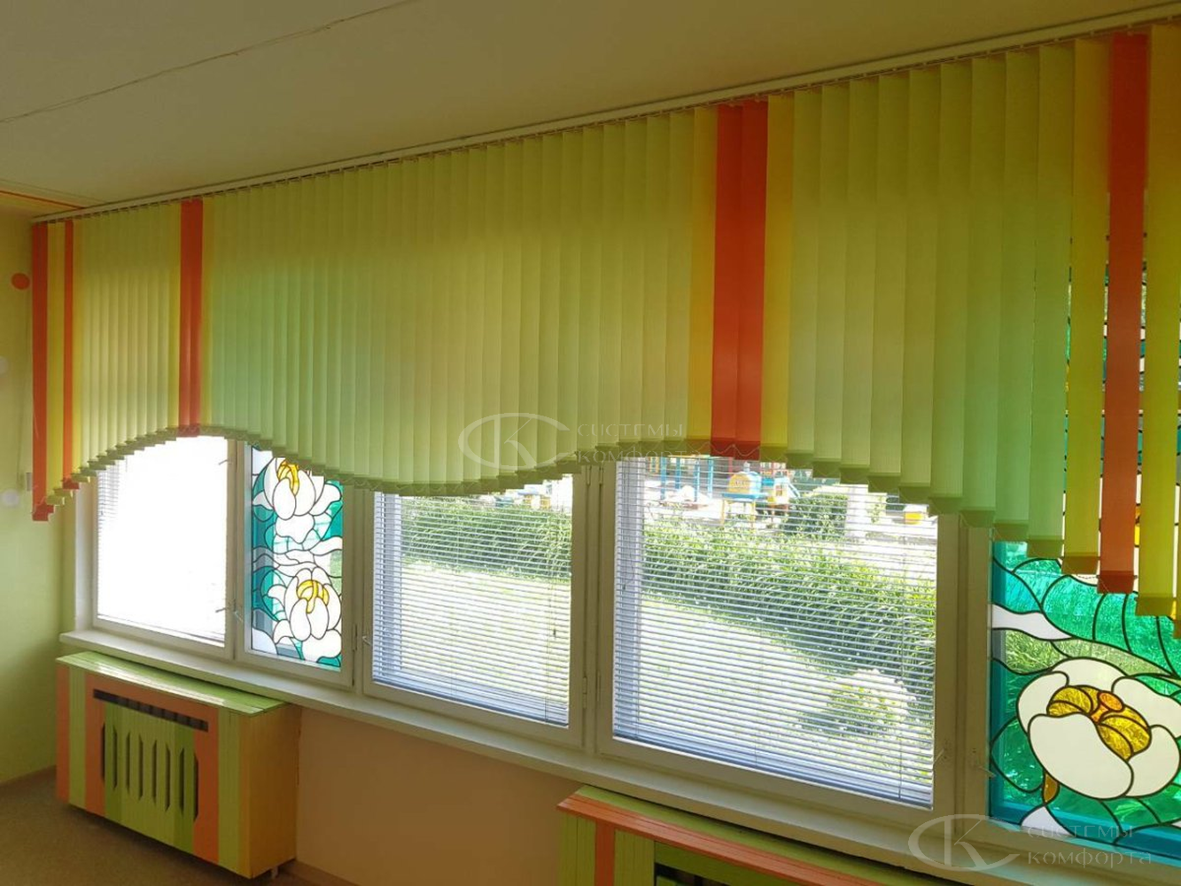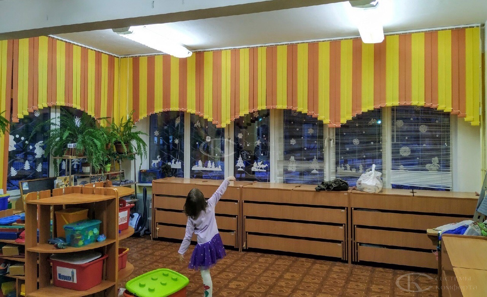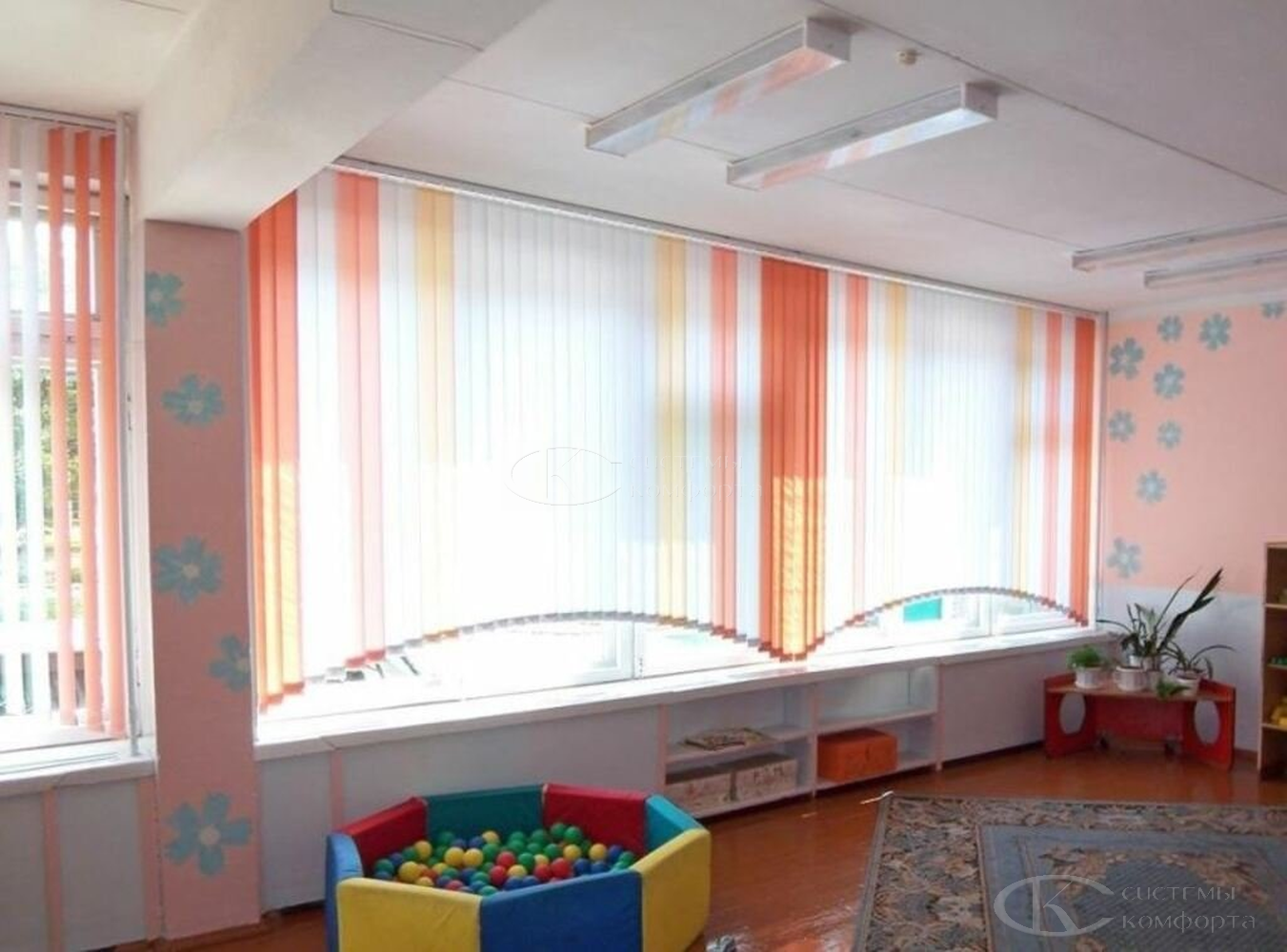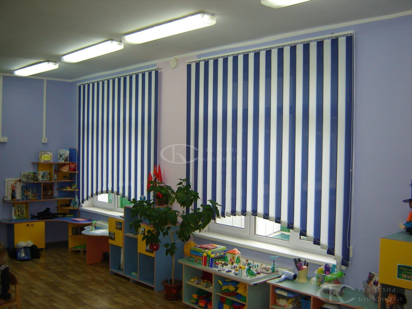 • Вертикальные тканевые жалюзи. Это классический вариант, благодаря которому можно эстетично оформить окна в комнатах детского сада. Для регулировки освещенности пространства ламели поворачиваются или сдвигаются, управлять ими можно с помощью легких пластиковых цепочек или шнуров. Одно из преимуществ такого варианта – широкое дизайнерское разнообразие: можно выбирать однослойные и многослойные жалюзи, производители предлагают самую широкую цветовую гамму.