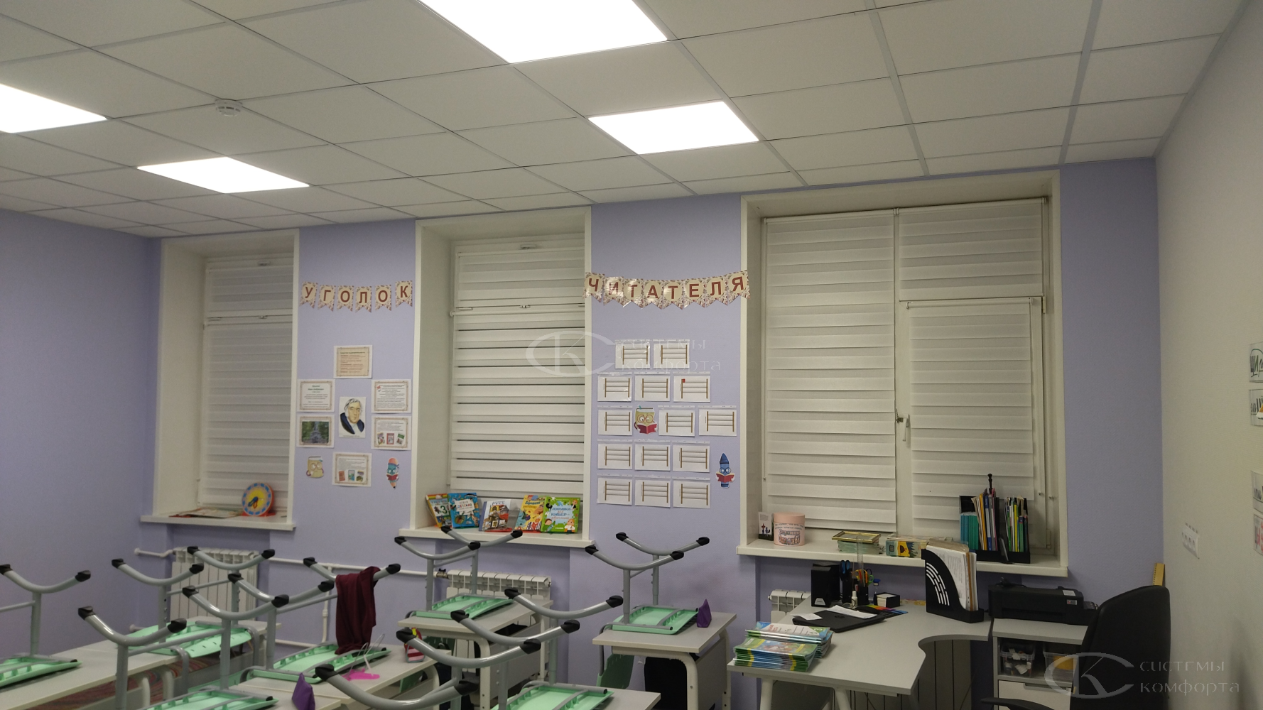 Часто их называют рольшторами. Механизм работы прост: с помощью цепочки ткань поднимается и опускается. Как правило, рулонные жалюзи устанавливают на одном-двух окнах, ближайших к доске, для затемнения в классе, если часто используется в работе проектор. В этом случае рекомендуем выбрать ткань «blackout» со 100% защитой от света. Но в этом случае надо понимать, что сама по себе светонепроницаемая ткань не создает полного затемнения в классе, так как просветы в любом случае будут по краям изделия. Плюсом будет то, что ткань на этапе производства обрабатывается специальными пылеотталкивающими растворами.