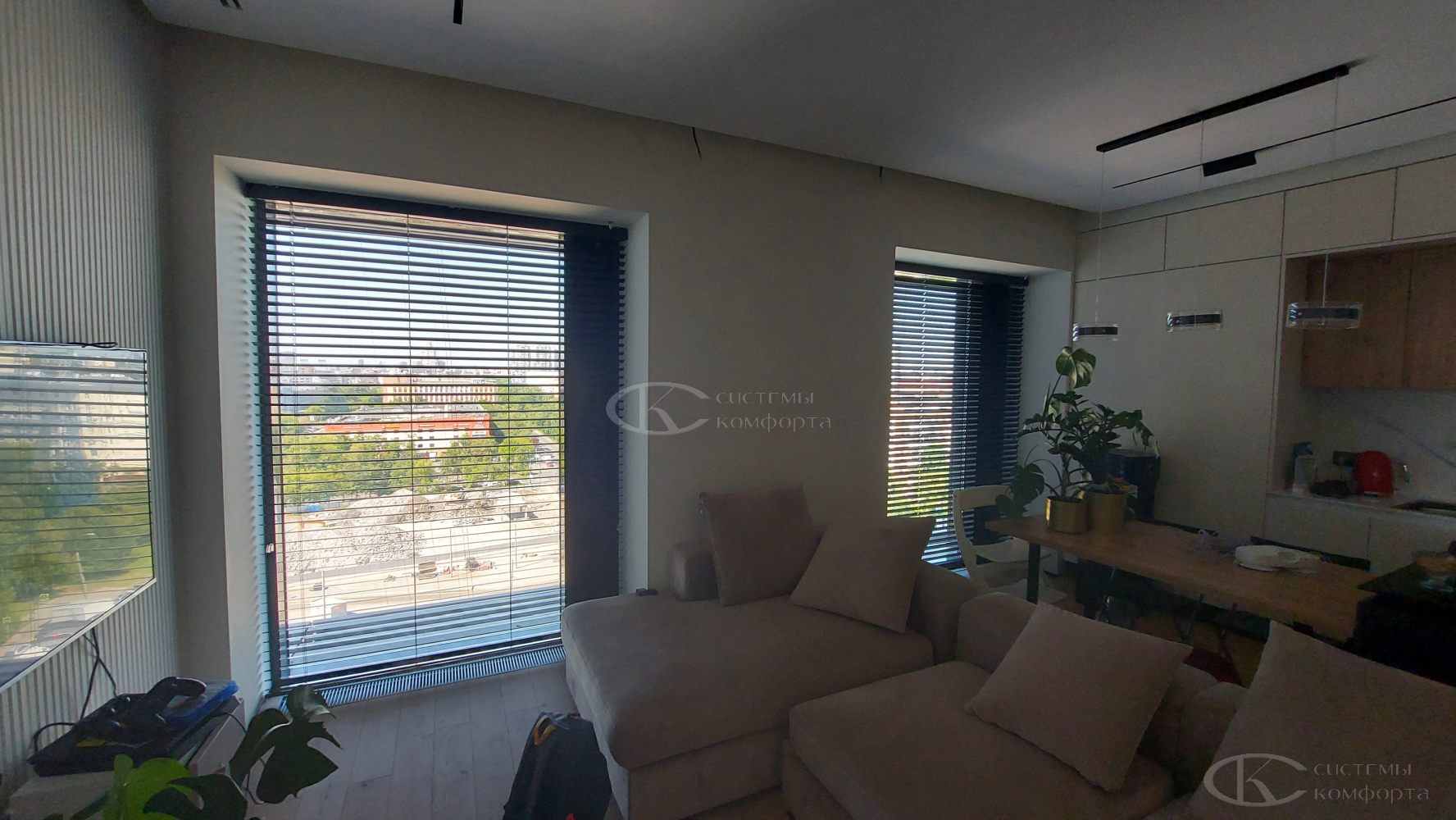 Компания «Системы комфорта» предлагает горизонтальные жалюзи с цветными алюминиевыми ламелями и перфорацией (опционально). Краска, которая используется в производстве, сертифицирована (экология), не выгорает на солнце и не истирается весь срок службы изделия.